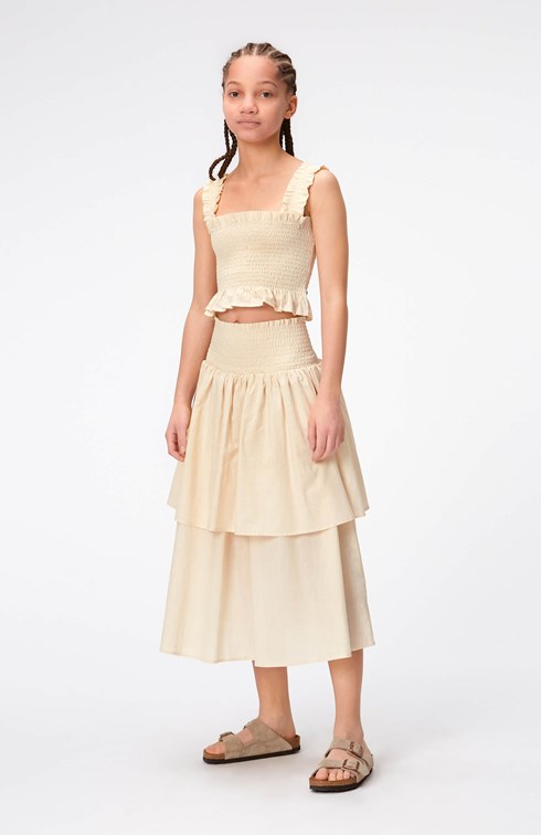 Sandfärgad lång kjol med brett midjestycke med smock, vilket gör den enkel att ta på och skön att ha på. Kjolen har två kjoltyg som ger volym. Kombinera kjolen med matchande topp i samma färg för ett komplett set.
