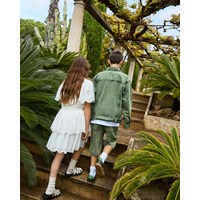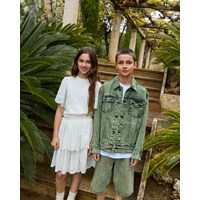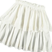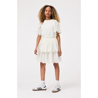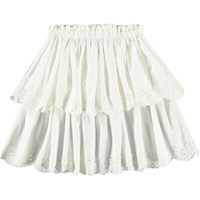 Vit kjol i ekologisk bomull. Kjolen har en fast midja med dragkedja, rundad kjol som samlas runt midjan. Kjolen är av medellängd och har två lager i olika längder med broderie anglaise längs kanten. Kombinera kjolen med en matchande topp för en komplett uppsättning.