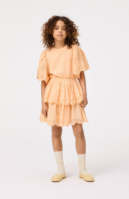 Ljusorange kjol i ekologisk bomull. Kjolen har en fast midja med dragkedja, rundad kjol som samlas runt midjan. Kjolen är av medellängd och har två lager i olika längder med broderie anglaise längs kanten. Kombinera kjolen med en matchande topp för en komplett uppsättning.