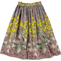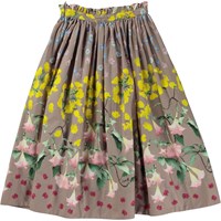 Gråbrun maxikjol med blommigt mönster. Här ses olika blommor som förgätmigej, smörblommor och änglatrumpeter som blir drösslade ut över kjolen. Denna kjol är tillverkad i 100% bomullspoplin, har en fast midja med dold dragkedja i sidan volangdetalj, voluminös kjol och en normal passform.