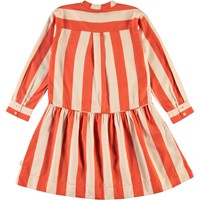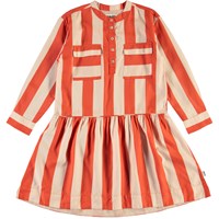 Cacao är en randig klänning i beige och röd. Klänningen har fickor på bröstet, samt knappstängning vid kragen