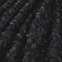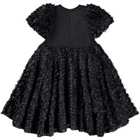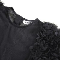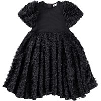 Svart knälång klänning med en stor kjol och puffärmar i en oversize-passform. Klänningen har små löv och fransar på ärmarna och kjolen, vilket ger en fin effekt. Den är lätt att ta på och av med en osynlig dragkedja på baksidan.
