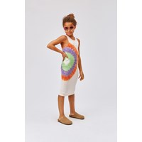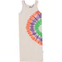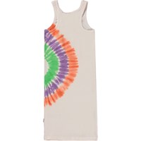 Caera är en lång, puderfärgad klänning i ekologisk bomull. Klänningen har ett stort tie-dye mönster i orange, grön och lila i ena sidan. Molos tie-dye mönster är handgjorda och kan därför variera något från plagg till plagg. Celia är en kortärmad klänning i ekologisk bomullsjersey. Klänningen har en kant vid hals och axlar med påsydd volang somgår hela vägen runt och bildar klänningens ärmar. Celia är här med rosor över hela klänningen.