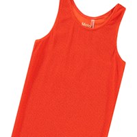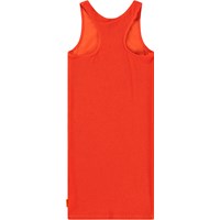 En stretchig och knälång röd tanktoppklänning med textur. Klänningen är figurnära med breda axelband och en rund halsringning. Materialet torkar snabbt och är perfekt för poolen eller stranden.