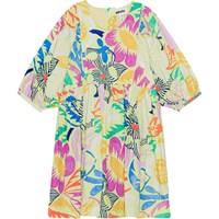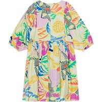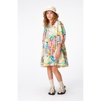 Lös ljusgrön klänning i ekologisk bomull. Klänningens överdel har rund hals med trekvartslånga ärmar som stängs med en liten knapp baktill. Klänningen har en söm på mitten med massor av rynkning som gör kjolen voluminös. Klänningen är enkel att ta av och på med den osynliga dragkedjan baktill. Unikt mönster av multifärgde konstnärliga blommor.
