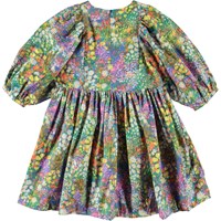 Caio är en multifärgad klänning med blommor. Klänningen har en lös passform med fyllig kjol och puffärmar. Klänningen är tillverkad i ekologisk bomull och har dold dragkedja baktill.