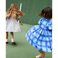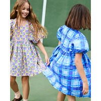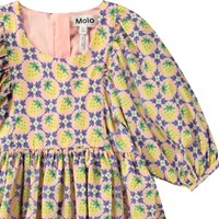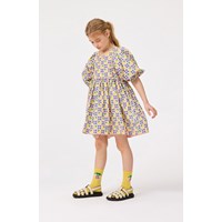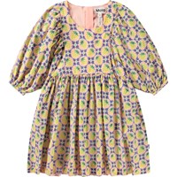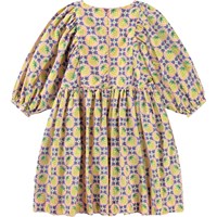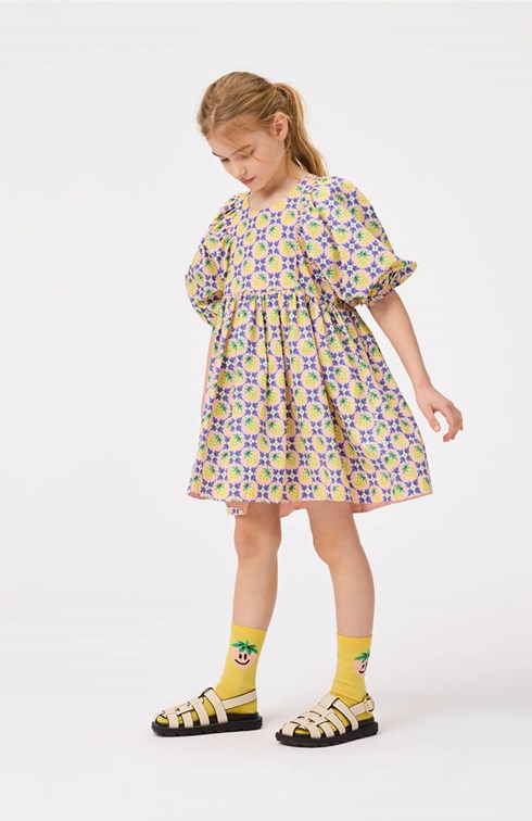 Knälång rosa klänning i ekologisk bomull med ett mönster av gula jordgubbar och vita blommor, som blandas samman för att skapa ett vackert mönster. Klänningen har en oversize passform med gott om veck, ärmlängd till tre fjärdedelar som knäpps med en liten knapp på baksidan, och en osynlig dragkedja på baksidan för enkel av- och påtagning.