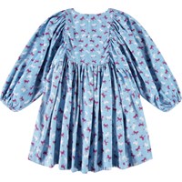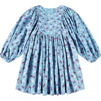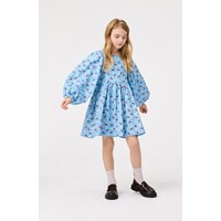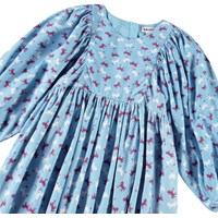 Knälång ljusblå klänning i en mjuk bomullsblandning med ett mönster av hästar i vinröda och vita färger. Klänningen har en oversize passform med gott om veck, långa ärmar med resår i ärmsluten och en osynlig dragkedja i ryggen, vilket gör den enkel att ta på och av.