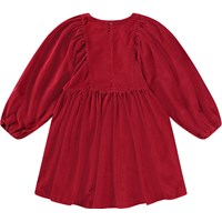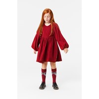 Bordeaux klänning i ekologisk bomull. Klänningen är knälång med en oversized passform med massor av veck vid ärmar och kjol. De långa ärmarna har elastik vid handlederna, vilket ger en lätt puffeffekt. Klänningen är lätt att ta på sig, tack vare den osynliga dragkedjan som sitter på baksidan.