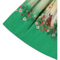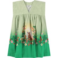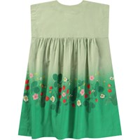 Ljusgrön och mörkgrön lös klänning i ekologisk bomull. Klänningen är knälång, med breda axelband, en v-ringning och rynkning i kjolen. Materialet i klänningen är lätt och luftigt, vilket gör den idealisk för poolen eller stranden. Klänningen har en ponny omgiven av färska jordgubbar framtill.