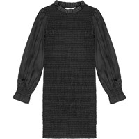 Elegant, knälång svart klänning i mjuk viskos med smockning som ger en tight passform, långa ärmar med smockeffekt vid handlederna och samlade axlar. Klänningen är lätt att ta på och bekväm tack vare sin elastiska design. Den runda halsen är elegant avslutad med en delikat volang.