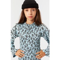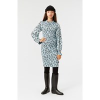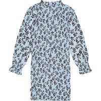 Elegant, knälång ljusblå klänning i mjuk viskos med smockning som ger en tight passform, långa ärmar med smockeffekt vid handlederna och samlade axlar. Klänningen är lätt att ta på och bekväm tack vare sin elastiska design. Den har en rund hals som elegant avslutas med en delikat volang. Klänningen har ett heltryck av vackra svarta konstnärliga fåglar som flyger på en ljusblå bakgrund.
