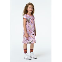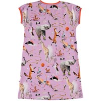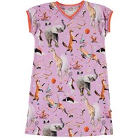 California är en ljuslila klänning med korta ärmar, v-ringning och randiga ribbkanter. På klänningen är det flera olika djur som sportar.