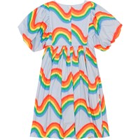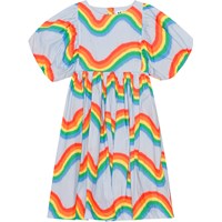 Rosa klänning med Molos ikoniska regnbåge i ekologisk bomull. Klänningen har rund hals, ärmar med massor av rynkning och stängs i ryggen med fyra knappar. Klänningen är skuren i midjan vilket ger en fin volym till kjolen.