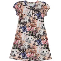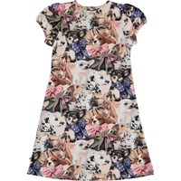 Camellia är en klänning med ett tryck av små hundar med en rosett runt halsen. Klänningen har en fin A-form och lätt puffade korta ärmar.