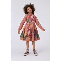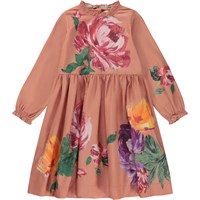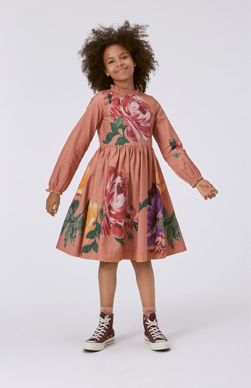 Rosa knälång klänning med blommigt mönster. Mönstret är handmålade blommor och om du tittar efter riktigt noga kan du se penseldragen. Detta mönster r speciellt då det är Molo´s egen och nya version av ett mönster som skapades på en silkesmölla i Lyon i Frankrike. En plats som har jobbat med alla de stora namnen som t.ex. Givenchy, Balenciaga, Chanel, Dior och nu också, Molo kids. Denna klänning är tillverkad i 100% bomull, har rund hals med volangdetalj, långa ärmar med volangdetalj, hög midja, kjol med mycket volym och en normal passform.