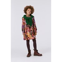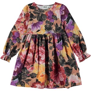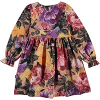 Rosa och lila knälång klänning med blommigt mönster. Mönstret är handmålade blommor och om du tittar efter riktigt noga kan du se penseldragen. Detta mönster r speciellt då det är Molo´s egen och nya version av ett mönster som skapades på en silkesmölla i Lyon i Frankrike. En plats som har jobbat med alla de stora namnen som t.ex. Givenchy, Balenciaga, Chanel, Dior och nu också, Molo kids. Denna klänning är tillverkad i 100% bomull, har rund hals, långa ärmar med volangdetalj, kjol med sving och en lös passform.