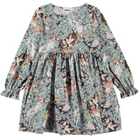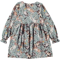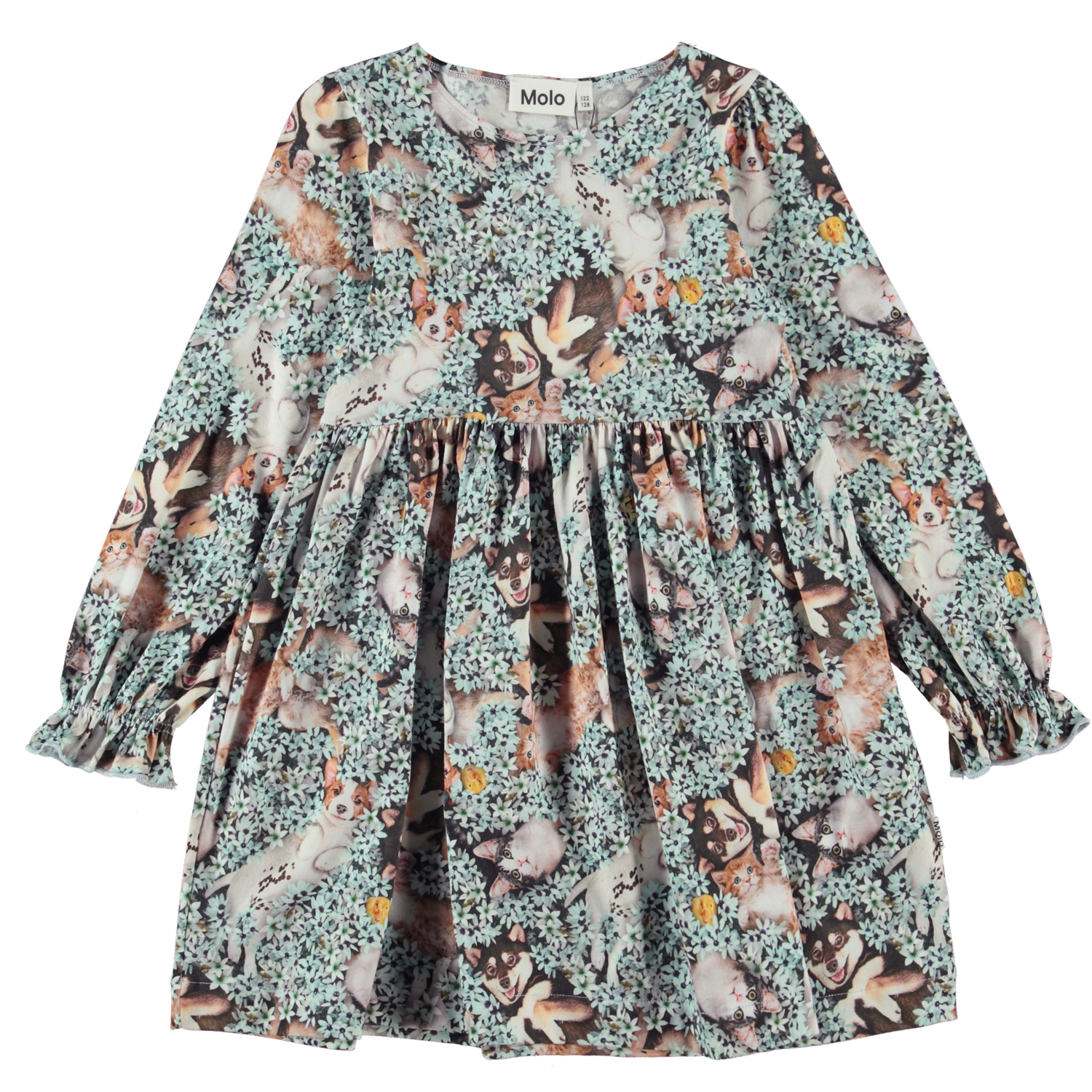Camie är en multifärgad klänning i ekologisk bomullsjersey. Klänningen har en högmidja med långa ärmar och gummiband och en liten volang vid handleden. Klänningen är här med kattungar och hundvalpar som rullr sig i en blå blomsteräng.