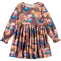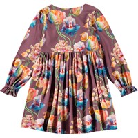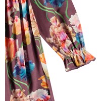 Lila knälång klänning i mjuk ekologisk bomullsjersey med en rund halsringning och långa ärmar med volangkant. Klänningen har en lös passform med ett konstnärligt mönster av färgglada tulpaner.