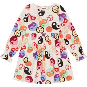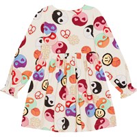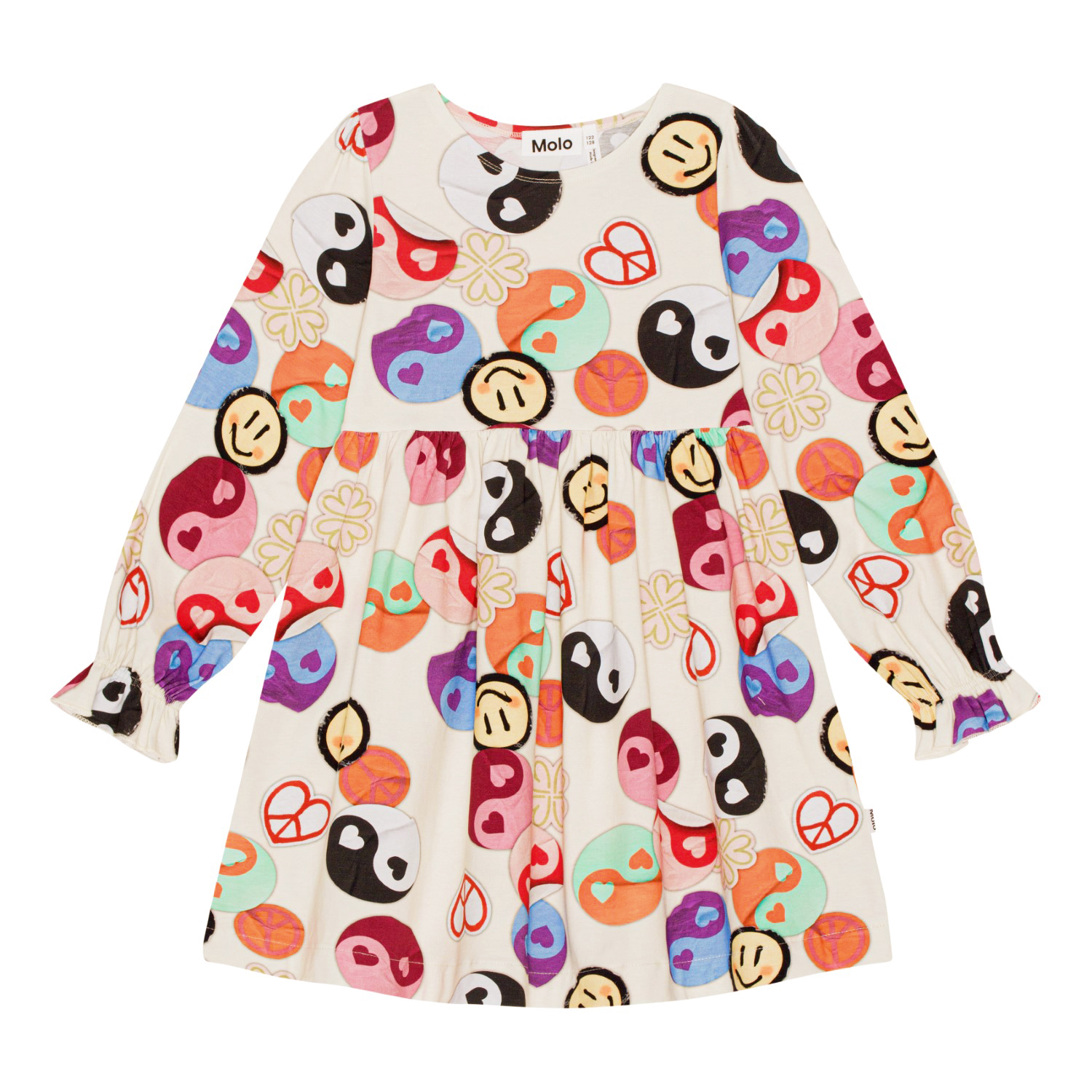 Råvit jerseyklänning i ekologisk bomull. Klänningen har en lös passform, rund hals och långa ärmar med en lite volangkant. Klänningens kjol har massor med rynkning och faller fint med den tunga jerseyn. Klänningen har ett mönster av multifärgade yin och yang klistermärken.