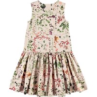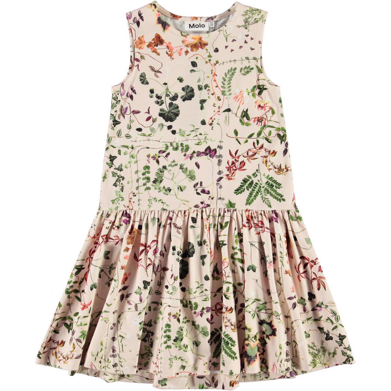 Candece är en rosa klänning med vilda blommor och blad. Klänningen har en linneinspirerad överdel och kjol med vidd och mer längd baktill.