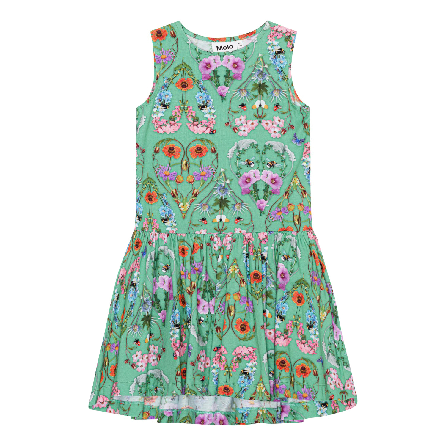 Grön klänning i mjuk ekologisk bomullsjesrey. Klänningens överdelär utan ärmar, breda axelband och en rund hals. Klänningen är skuren mitt på med massor av rynkning till kjolen. Mönstret är multifärgat med insekter och vilda blommor som bildar hjärtan.
