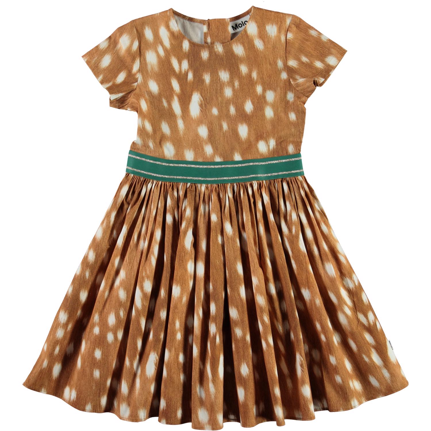 Candy är en brun klänning med vita fläckar som ser ut som en rådjurspäls. Klänningen är i poplin med stretch, vilket gör den extra bekväm att bära. Candy har dragkedja i nacken och en randig resår i midjan.