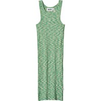 Knälång tanktoppklänning i stretchig ekologisk bomullsribb med breda axelband och en rund halsringning. Klänningen är vävd i gröna, vita och ljusbruna färger, vilket skapar en härlig textur.