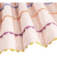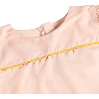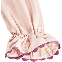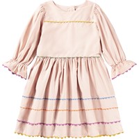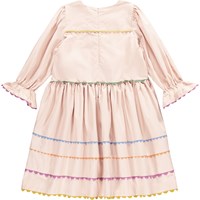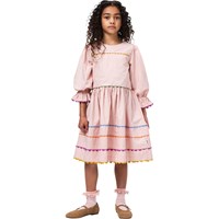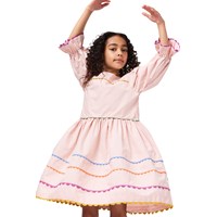 Rosa klänning i mjuk ekologisk bomullspoplin med rund hals och trekvartslånga ärmar med volangkant och resår vid ärmarna. Klänningen har en klassisk passform, en voluminös knälång kjol och är dekorerad med en vacker, vågig och färgglad kant som ger ett lekfullt och livligt utseende.