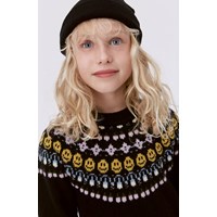 Svart stickad klänning med nordiskinspirerat mönster på kragen. Mönstret är inspirerat av nordiska sticktraditioner med en rolig Molo tvist. Denna stickade klänning är tillverkad i en mjukullblandning som är perfekt till de kallare dagarna. Den har rund hals med ribb, långa ärmar med ribb i slutet och en normal passform. Om du fryser om öronen kan du enkelt matcha klänningen med mössan, Kamma, i samma mönster, för en söt look.