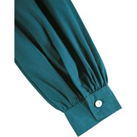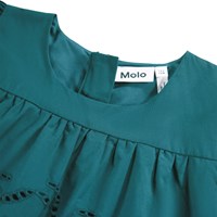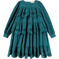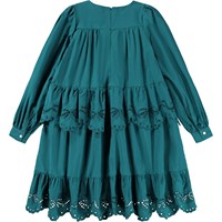 Knälång grön klänning i ekologisk bomullspoplin. Klänningen har långa ärmar med knappstängning och tre volanglager på toppen och kjolen som är dekorerad med grönt broderi anglaise. Den osynliga dragkedjan på baksidan gör den enkel att ta på sig.