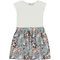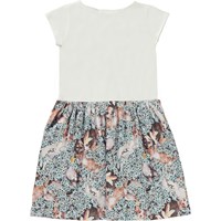 Carla är en kortärmad klänning i ekologisk bomullsjersey. Klänningen har en vit topp och kjolen är med kattungar och hundvalpar rullar sig tillsammans i blå blommor.