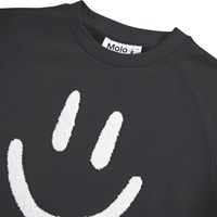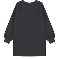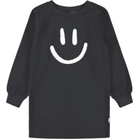 Långärmad svart sweatshirtklänning i mjuk ekologisk bomull med en broderad smiley. Klänningen har raglanärmar och ribbade kanter runt halsen och ärmarna.