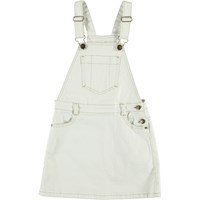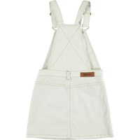 Carolyn är en vit hängselklänning i denim. Axelbanden på klänningen kan regleras i längden. Klänningen har knappknäppning i ena sidan och har en stor ficka på bröstet samt vanliga jeans fickor.