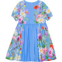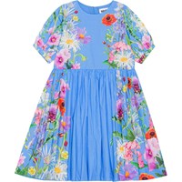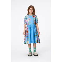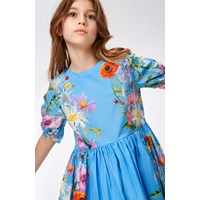 Blå knälång klänning med färgrika sommarblommor i ekologisk bomull. Klänningen har en rund hals, korta rynkade ärmar och knappar baktill. Klänningen är skuren i midjan med en påsydd kjol som ger fin volym. Klänningen är enkel att ta av pch på med den osynliga dragkedjan i ryggen.