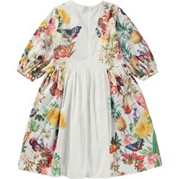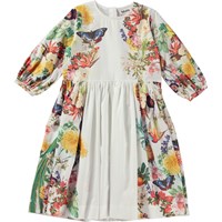 Casey är en vit knälång klänning i ekologisk bomull. På de 3/4 långa ärmarna och ner längs sidorna på klänningen är det ett förgrikt tropiskt mönster med tropiska blommor, frukter och fjärilar. Kjolen är rynkad i midjan vilket ger en fin volym, Klänningen har dragkedja baktill.