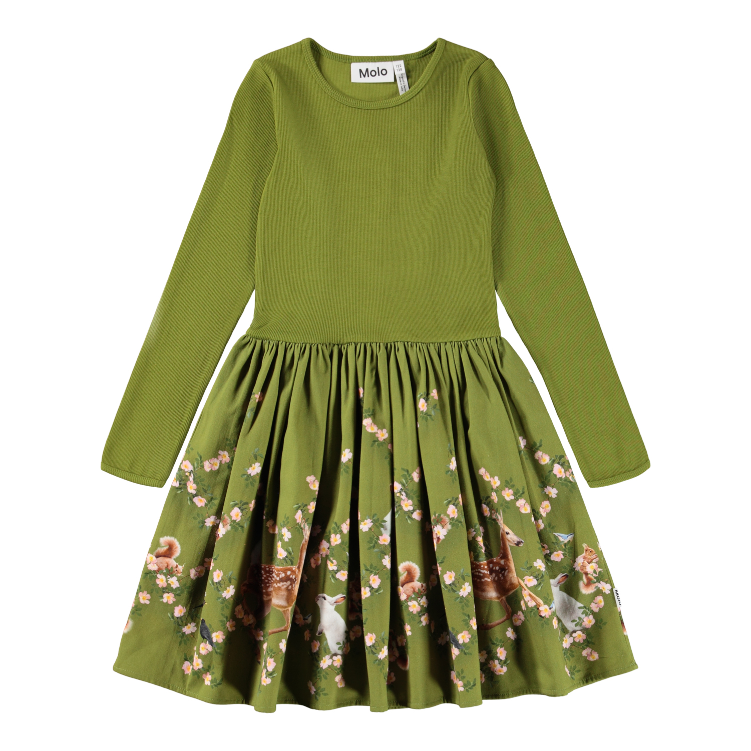 Långärmad grön klänning i ekologisk bomull med en åtsittande ribbad topp, en rund halsringning och en volyminös cirkelskuren kjol i bomullsflanell. Kjolen har ett mönster av skogsdjur och blommor.