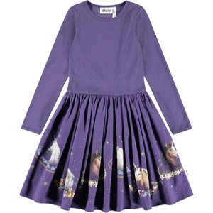 Långärmad lila klänning i ekologisk bomull med en åtsittande ribbad topp, en rund halsringning och en volyminös cirkelskuren kjol i bomullsflanell. Kjolen har ett mönster av enhörningar och stjärnhimlen.