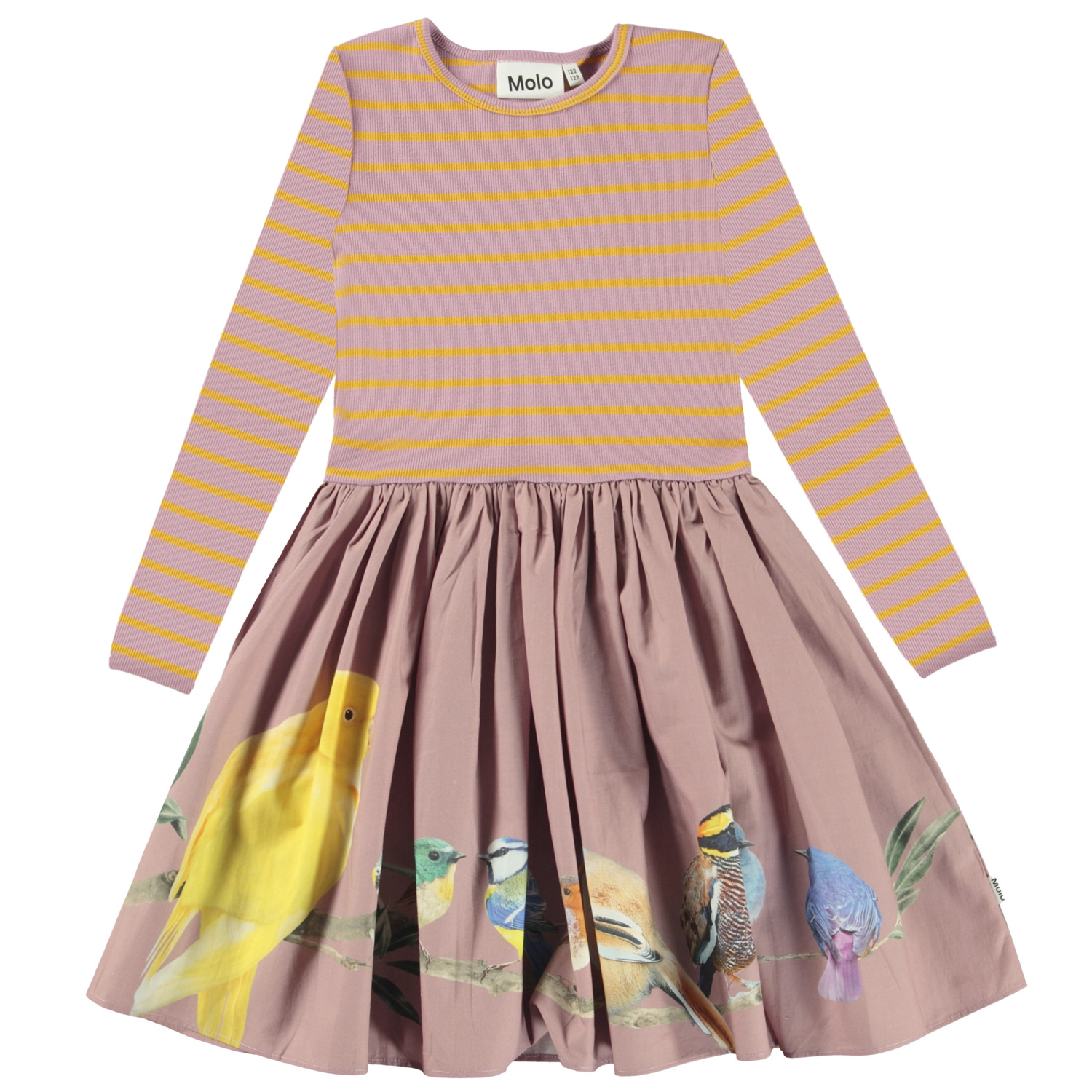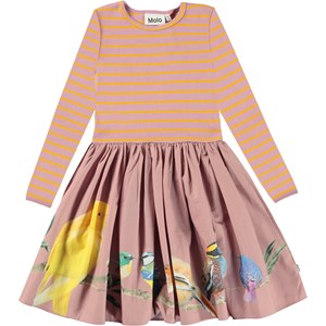 Casie är en ljuslila klänning med överdelen i ribb med orangea ränder. Klänningen har långa ärmar och en feminin poplinkjol med fåglar.
