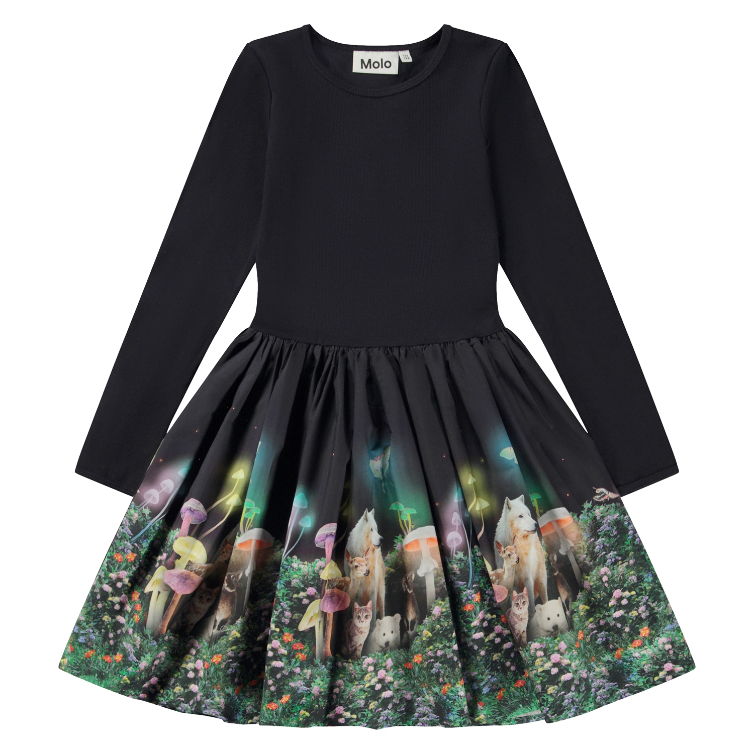 Svart knälpng klänning med rundad kjol i popin med mönster. Här visas det som händer på natten i månens trädgård. En trädgård där blommorna bara blommar när solen går ner. Blommor med namn som nattens drottning, månblommor, änglatrumpet, nattljus och nattblommande jasmin. En plats dit äventyrslystna djur kommer. Varg och lamm, uggla och fjäril, isbjörn och grönögda katter. Kaninungar och rådjurskid. Gigantiska svampar stora som träd och luften fylld av natten ljud. omfamna trollen och klä ut dig till ett av skogens barn, som en rådjursunge eller ett träd. Denna klänning är tillverkad i 100% bomull, har rund hals med smal ribbkant, långa ärmar, poplinkjol med mönster och en normal passform.