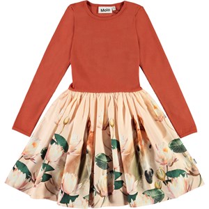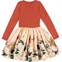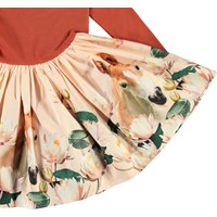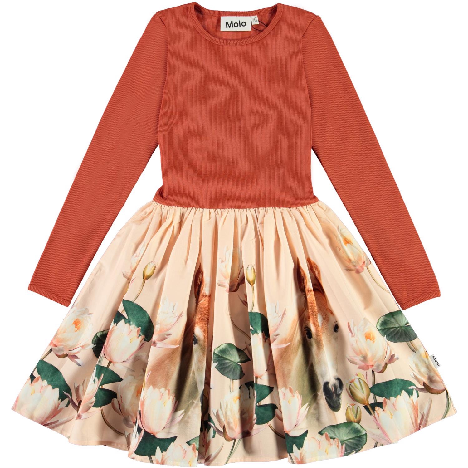 Casie är en långärmad tvådelad klänning med en röd ribbad topp. Klänningens kjol har ett tryck av ett föl och rosa näckrosor.