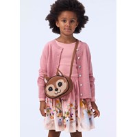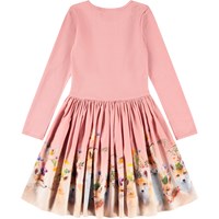 Långärmad rosa klänning i ekologisk bomull med en åtsittande ribbad jerseytopp och poplinskjol. Klänningen har en normal passform med dekorerade djur på kjolen.