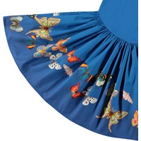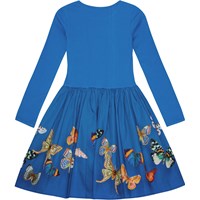 Långärmad blå klänning i ekologisk bomull med en tight ribbstickad tröja, rund hals och en voluminös kjol i bomullspoplin med ett tryck av färgglada fjärilar.