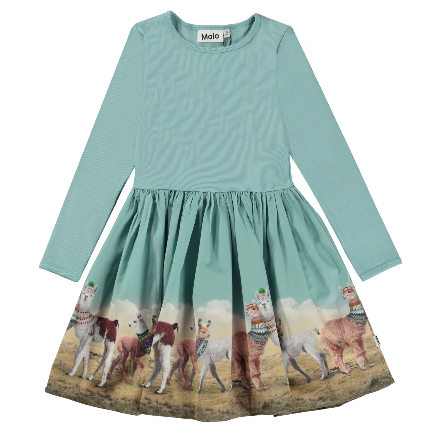 Ljusblå knälång klänning med rundad kjol i poplin med mönster. Här ses söta och roliga lamor med massor av humor. De har fått på sig Molo´s egna stickade plagg och är ordentligt påklädda med mössor, halsdukar och tröjor. Denna klänning är tillverkad i 100% bomull, har rund hals med smal ribbkant, långa ärmar, poplinkjol med mönster och en normal passform.