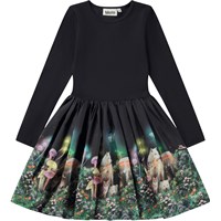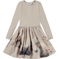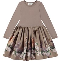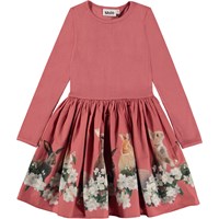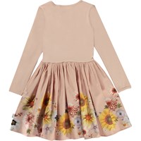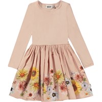 Rosa knälång klänning med rundad kjol i poplin med mönster. Här ses massor av olika blommor som t.ex. solrosor och dahlior i rosa och gula nyanser. Denna klänning är tillverkad i 100% bomull, har rund hals med smal ribbkant, långa ärmar, poplinkjol med mönster och en normal passform.