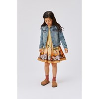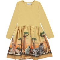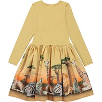 Casie är en långärmad klänning med rundad kjol i ekologisk bomull. Klänningens topp är ribbad jersey i gul, medan kjolen är i poplin med savannens djur som ligger framför de höga träden i solnedgången.