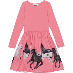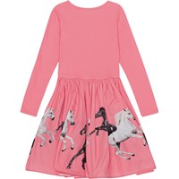 Långärmad rosa klänning med rundad kjol i ekologisk bomull. Toppen är tight i ribbad jersey som gör den skön att ha på och enkel att ta av och på. Kjolen är i bomullspoplin med ett mönster av hästar i bruna och vita nyanser runt om.