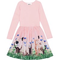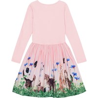 Långärmad rosa klänning med rundad kjol i ekologisk bomull. Toppen är tight i ribbad jersey medan kjolen är i bomullspoplin med ett mönster av lekande kattungar.