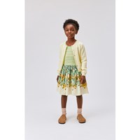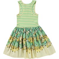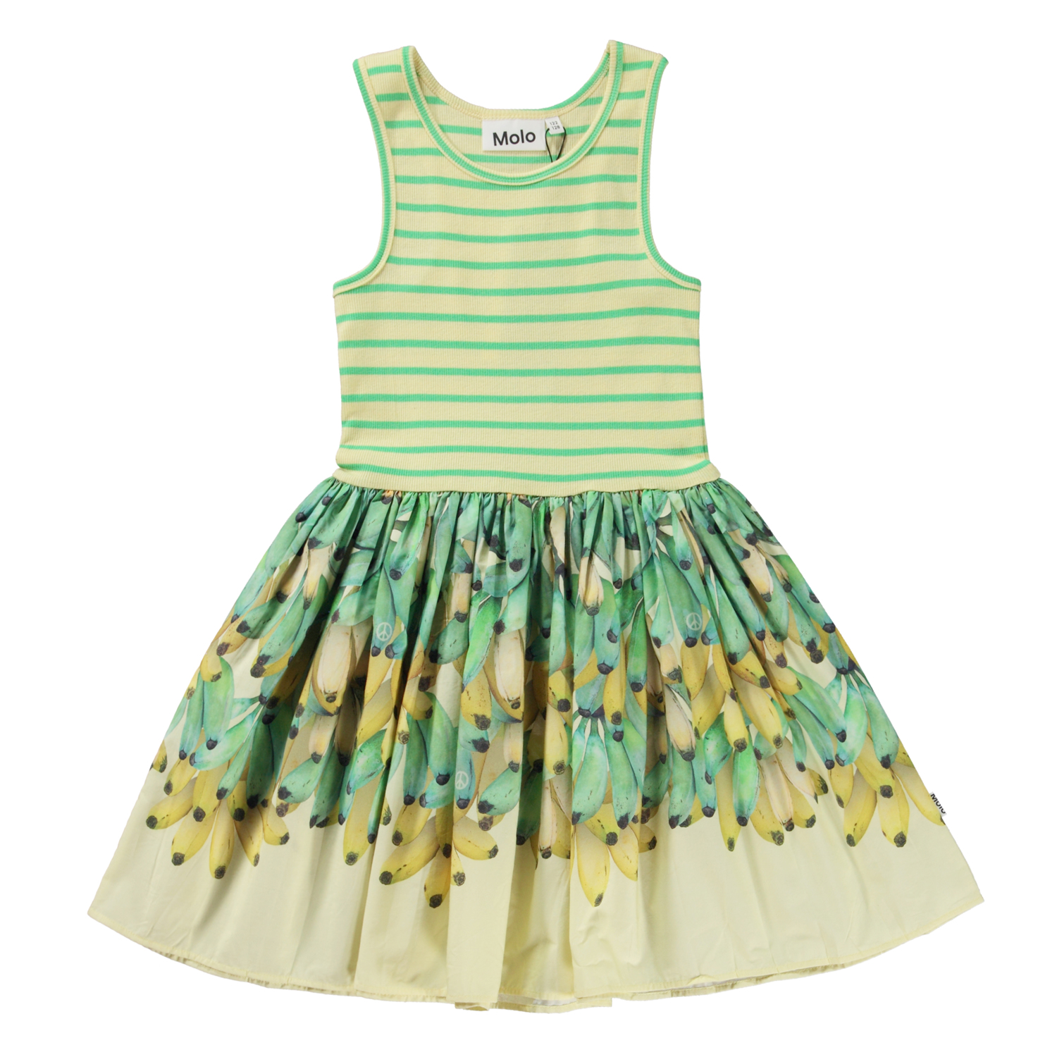 Cassandra är en klänning utan ärmar med rundad kjol i ekologisk bomull. Toppen är ribbad jersey i gul med gröna ränder och kjolen är i bomullspoplin. Kjolen är med bananklasar nertill.