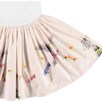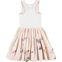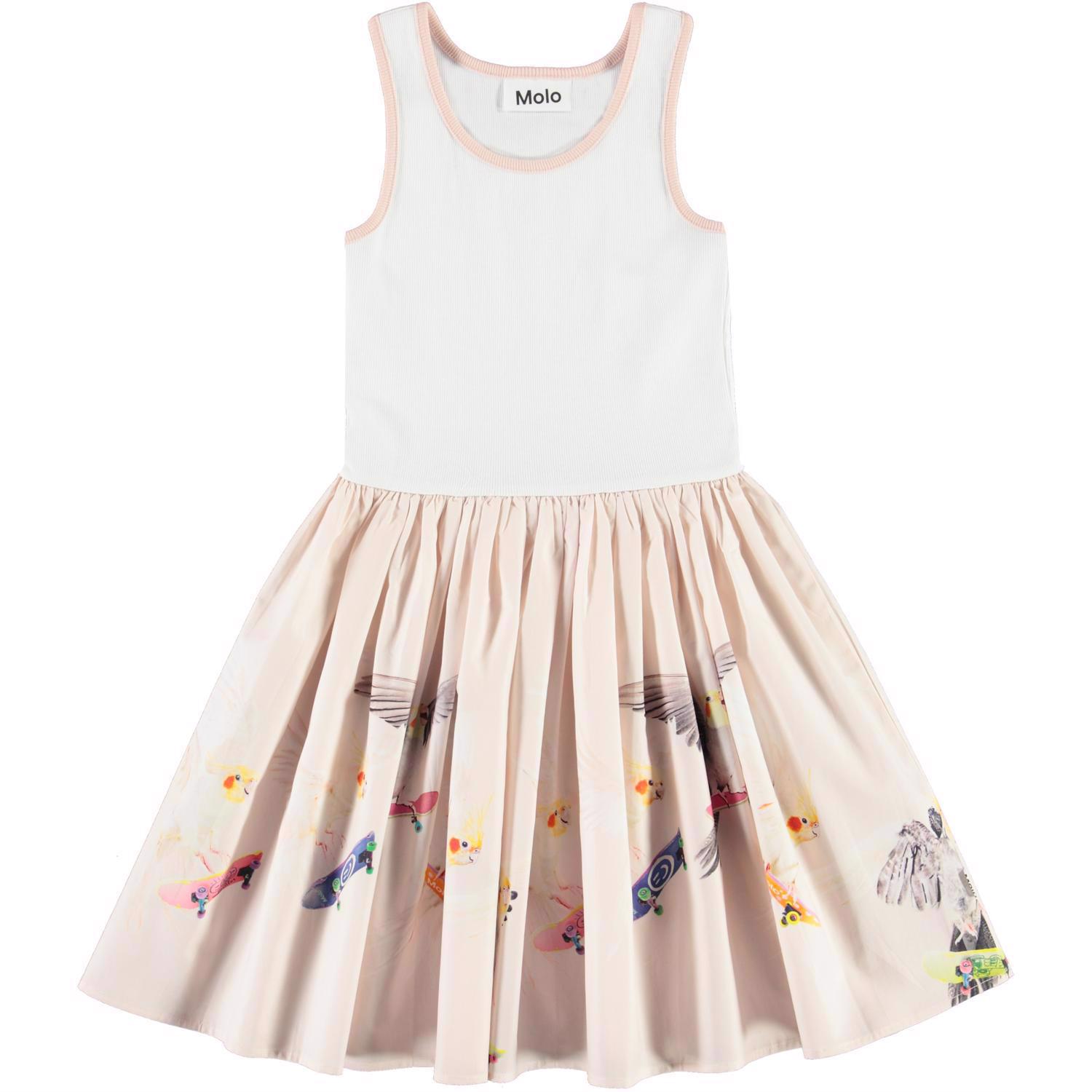 Cassandra är en tvådelad klänning där överdelen är utan ärmar och i vit ribb med rosa kanter, medan kjolen är rosa med fåglar som åker skateboard.